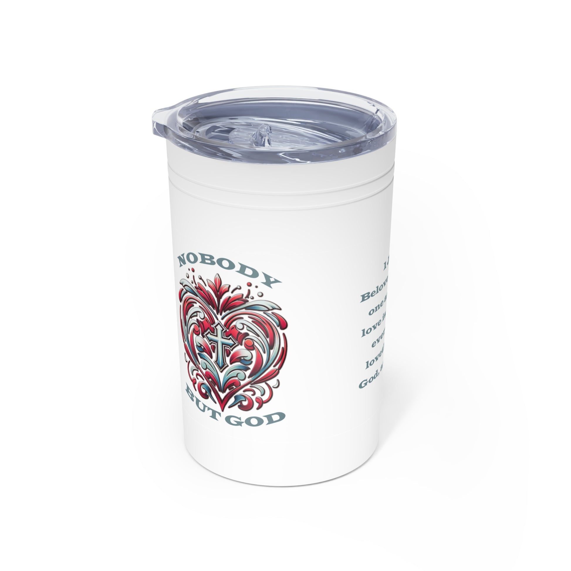 - "Nobody But God" encircles a heart with a subtle cross on the back, symbolizing God's love.