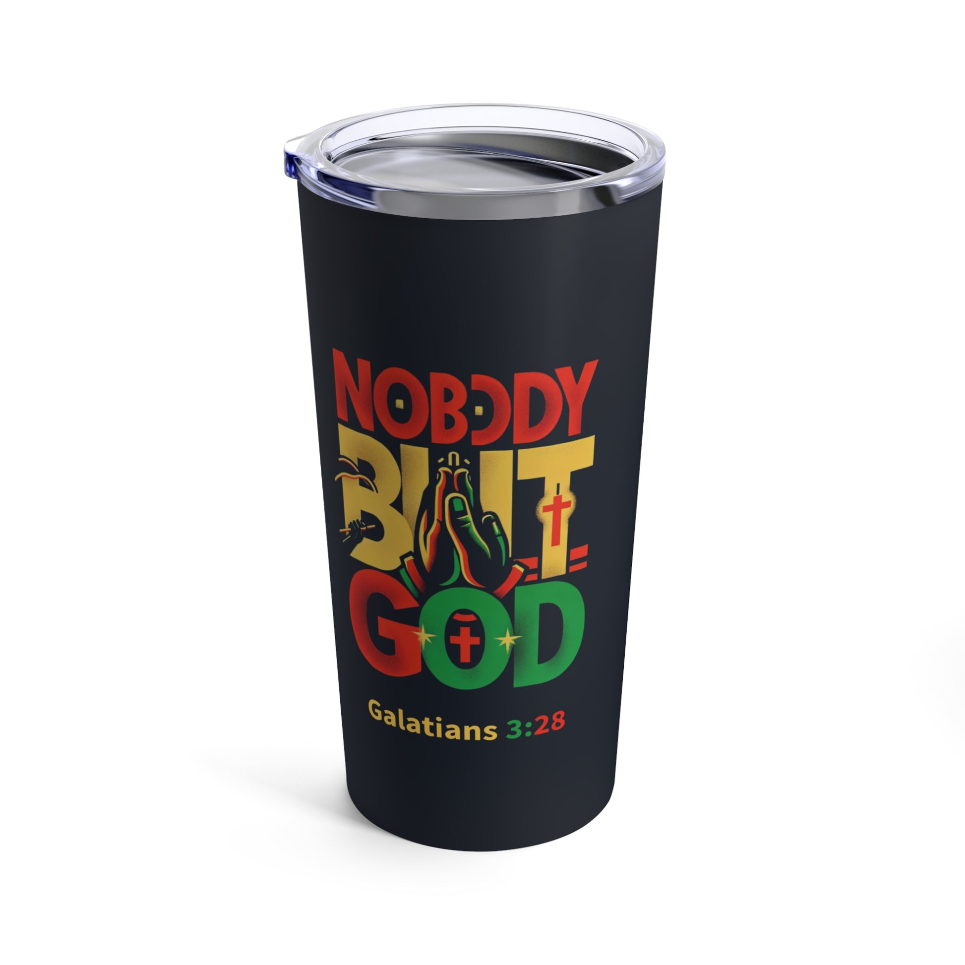 - Features the bold "Nobody But God" text in red, black, and green colors, symbolizing pride and freedom.