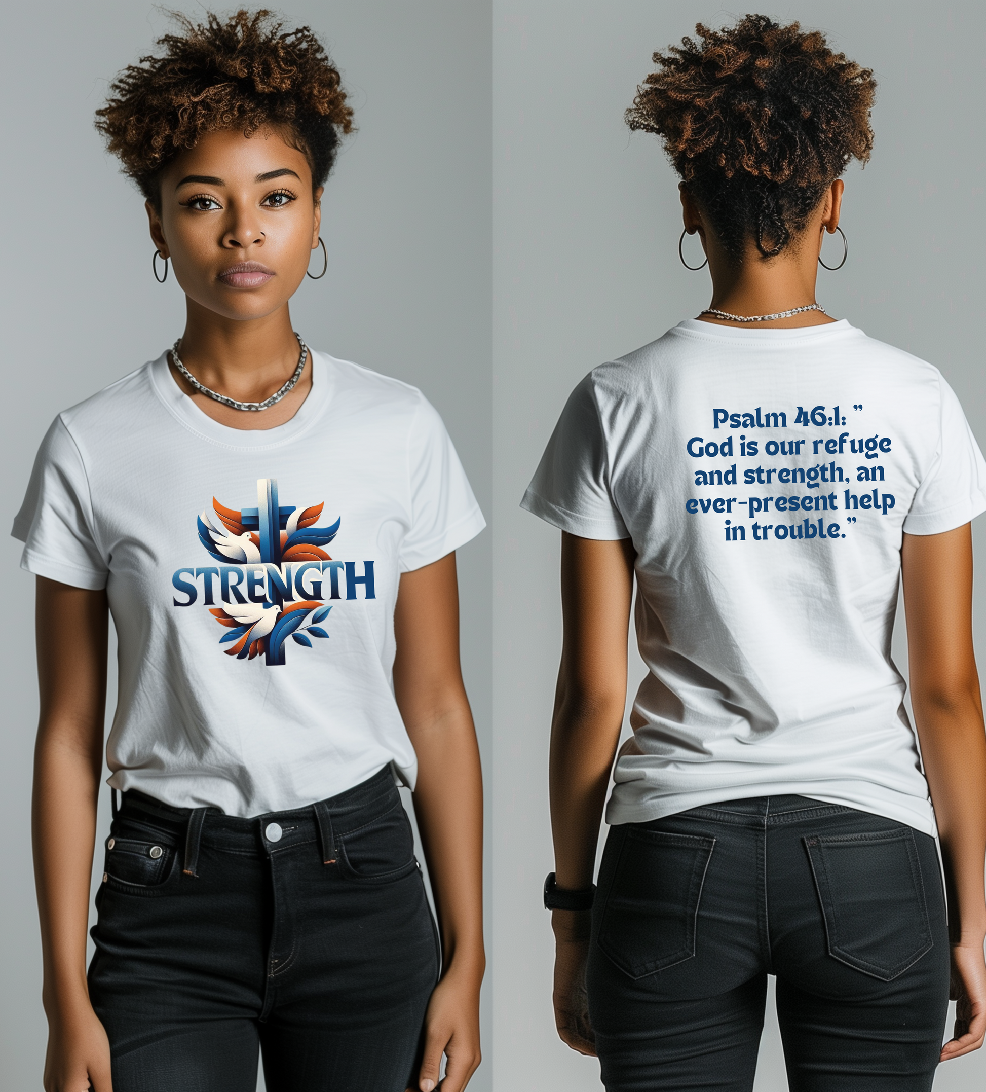 Elevate your journey of resilience with our "Strength" T-shirt, a symbol for those who find their power in faith during life's trials.